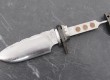Opo #27 (Wolf Witch Weaver), 14 cm blade sandwich Damast, Hand carved wolf howling at the moon. Fittings are copper coated and with a personalised rune glyph on the but cap. The blade is made for a practising alchemist sorceresses and as such is a properly made Athema.